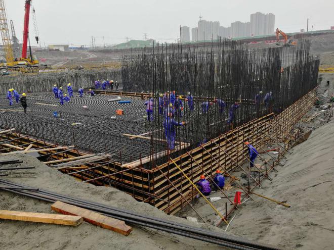 因為水利工程的特殊性,通呂運河水利樞紐工程必須在5月底主汛期來臨前完成水下部分施工,實現通水目標,搶抓工期成為貫穿整個施工過程的關鍵詞。自開工以來,現場最多的天氣便是下雨,據統計,自12月以來,雨水天氣達51天。為了確保通水目標按期實現,以及年底前完成主體工程計劃任務,在連續下雨、前期因清淤困難減緩了施工進度等不利情況下,自主體基坑開挖后,項目部便開始積極組織工人加班加點,沒有過絲毫的放松和懈怠,在參建各方的一致努力下,最終將原計劃于2月25日澆筑的泵站底板提前到了2月16日實施,從而為后續施工爭取到了更多的機動時間。目前節制閘1#、2#、3#底板及泵站已澆筑完成,待泵站工程搶出地面后,最后澆筑節制閘4#底板,進而完成主體基面以下部分施工。目前現場施工人員接近三百人,我們搶抓有利天氣,有序進行土方、管樁、水泥攪拌樁、主體結構鋼筋、模板等平行施工作業,工作面全面展開,后續總體施工進度已處于可控狀態,我們向著順利完成水下驗收的目標又邁出了堅實有力的一步。
